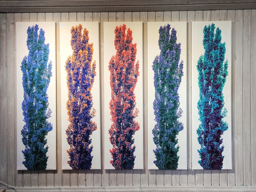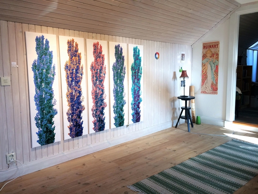 Ett utforskande av färger, lite med Goethes färgcirkel i tankarna, färger i samspel och kontrast inom och mellan de enskilda popplarna, skapade denna Poppel Art. Jag visade dem under Vadstena Konstrunda 2018.