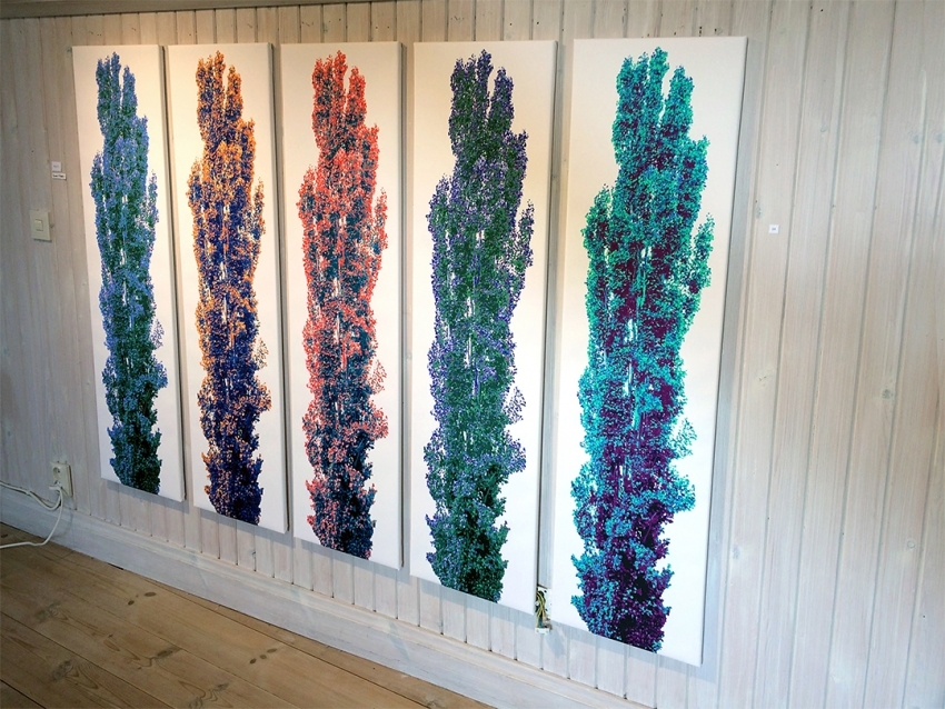 Väggen de hängts på är ovanligt låg, 150 cm. Det är fint att popplarna fyller höjden. Högre versioner vore en möjlighet på en vanlig vägghöjd.