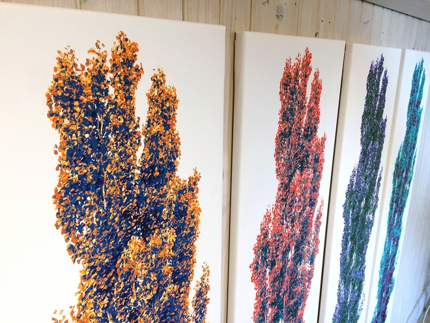 Popplarna ör 32 x 120 xm utförda med pigmentbläck på canvas spänd på kilram. De är härliga i sin rena färgverkan och behöver ses i verkligheten, detta är mobilbilder.